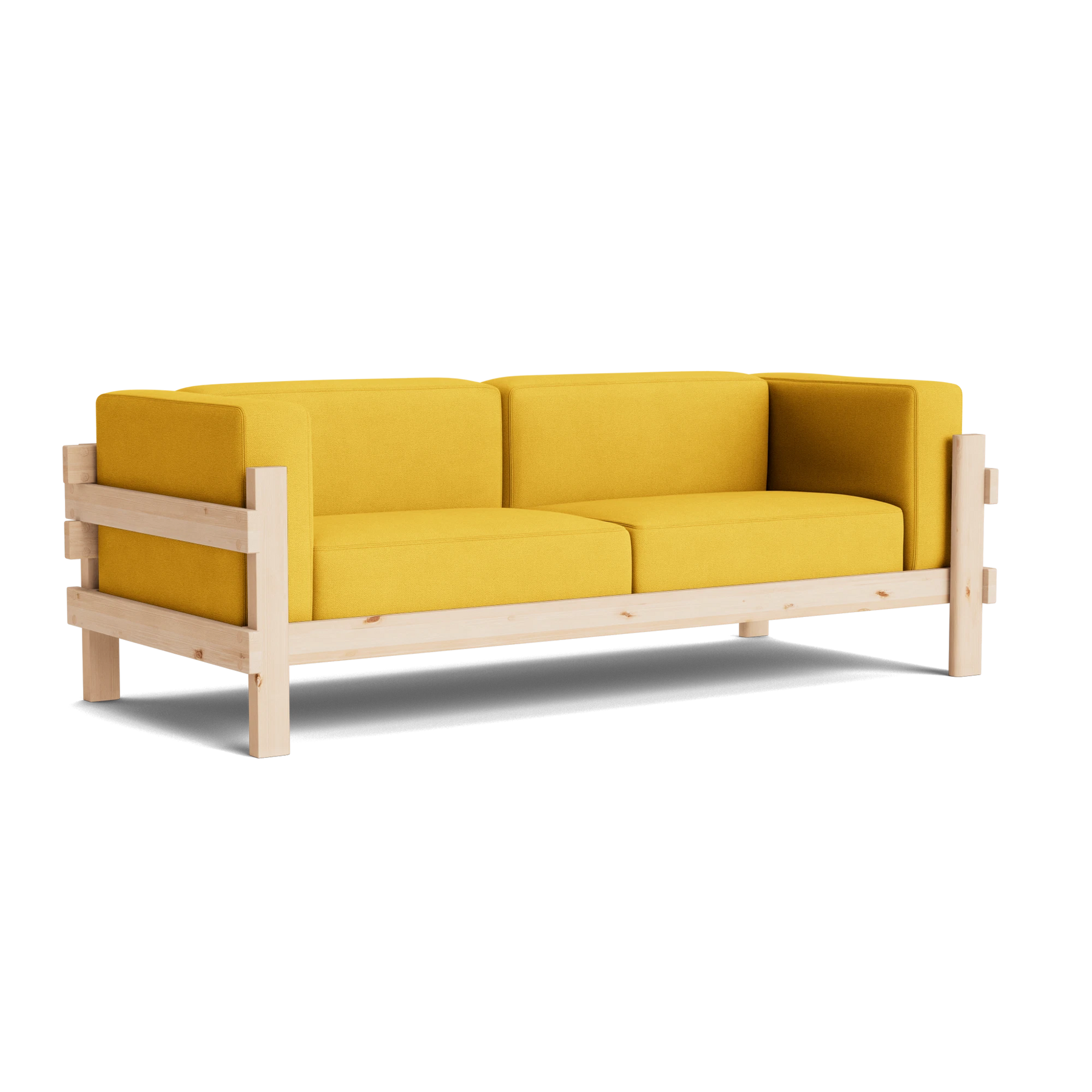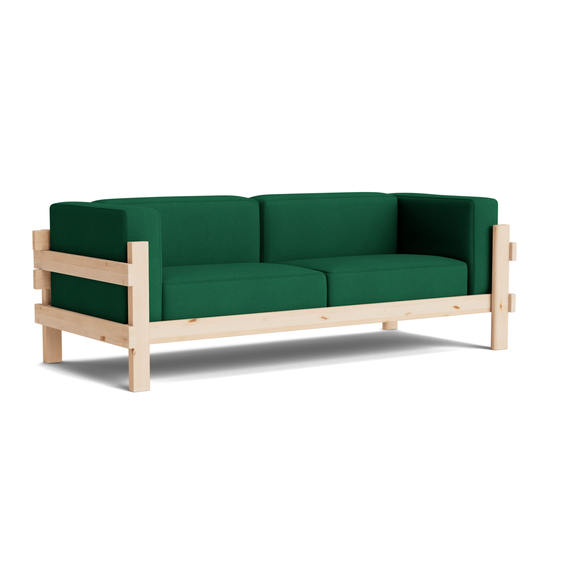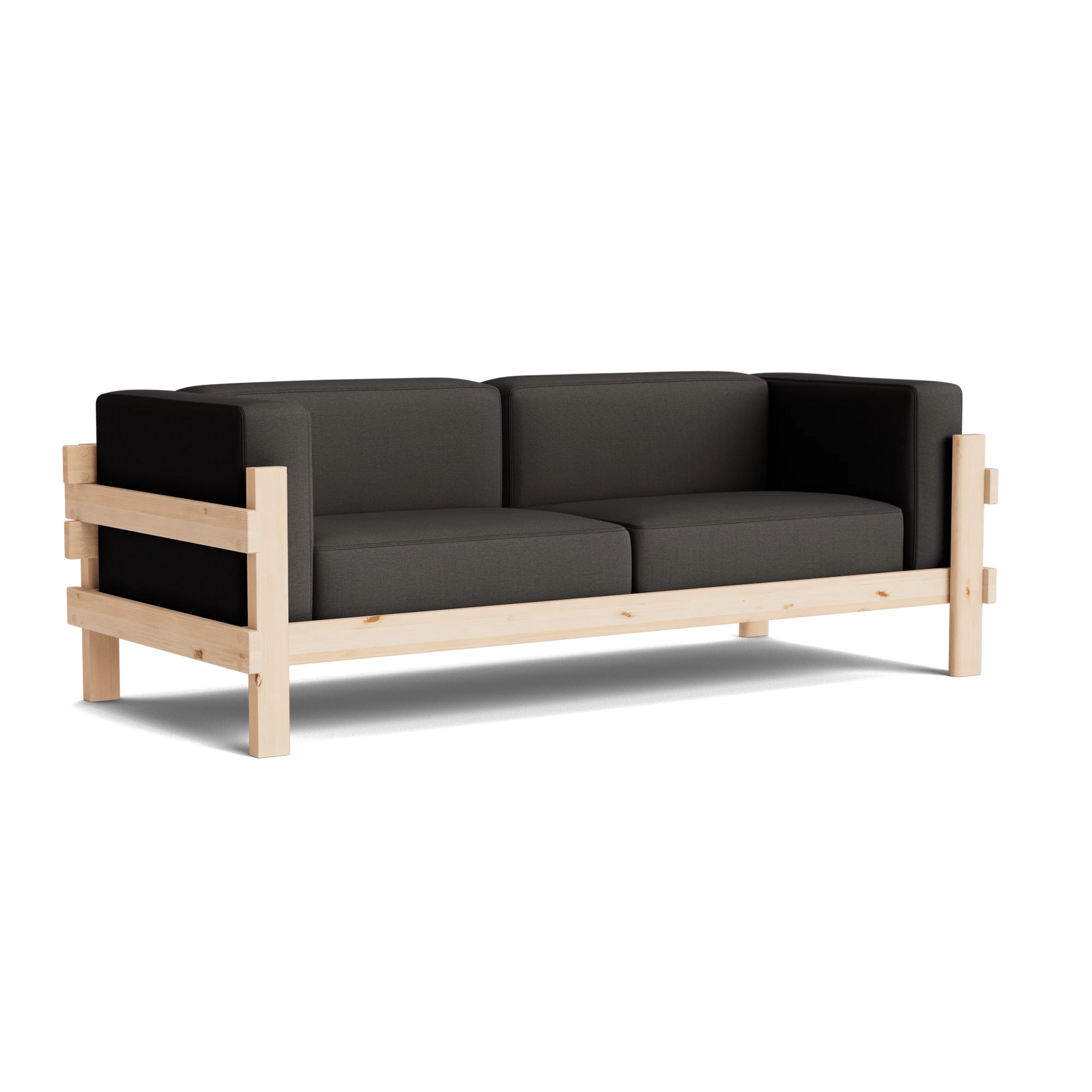 The Kube Sofa is a bold take on mid-century style, designed by Simon Legald. Featuring a sturdy, sculptural pine wood frame, its cubist form is softened with plush, loose cushions on the seat, back, and arms for everyday comfort. Crafted with thick planks that highlight the wood’s natural grain and durability, the frame is built to last and will develop a unique patina over time. The contrast between the clean wooden structure and the soft upholstery creates a balanced, modern look with timeless appeal.